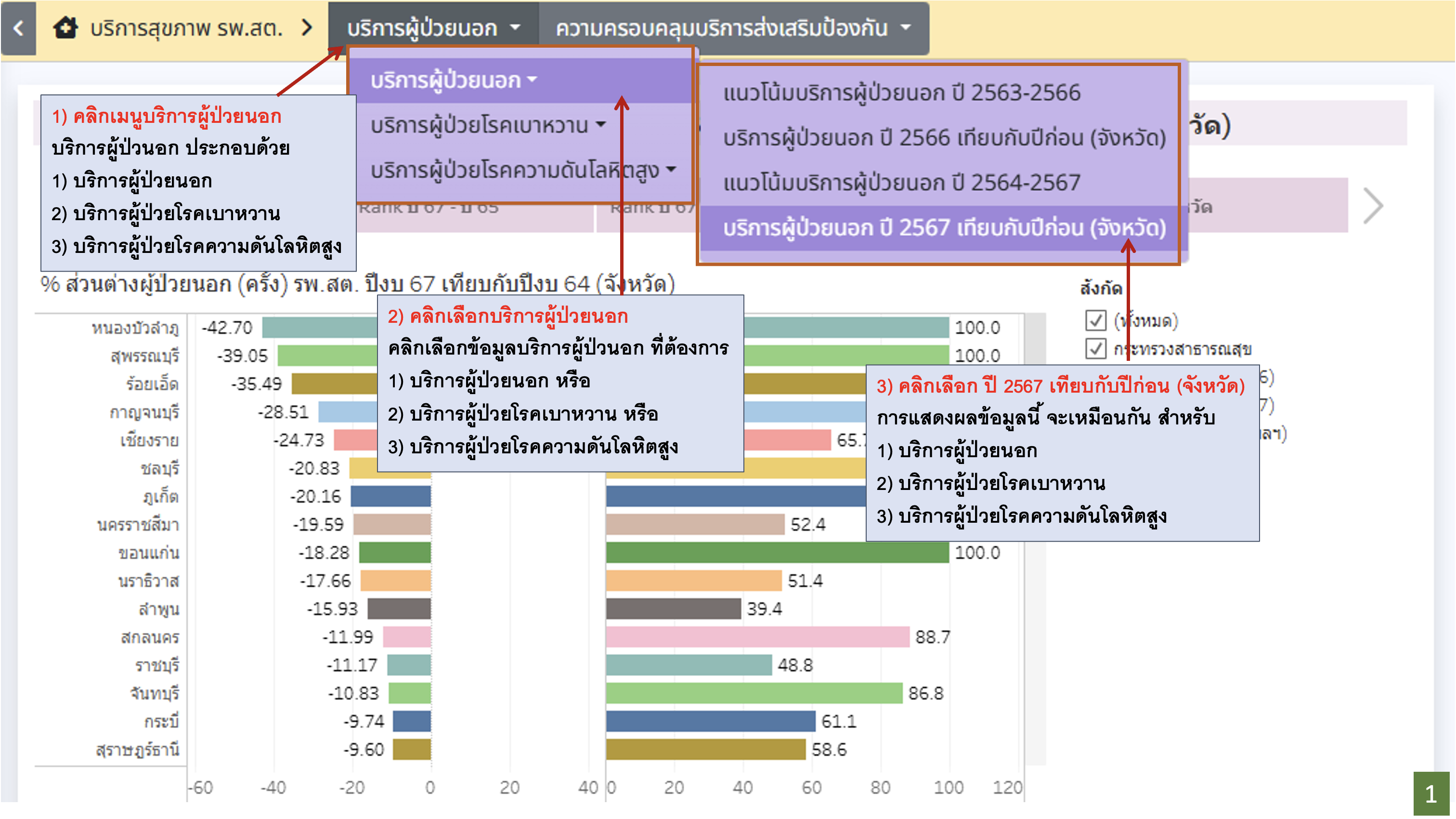 1) การเลือกเมนู: ข้อมูลบริการผู้ป่วยนอก บริการปีงบ 2567 เทียบกับปีก่อน (จังหวัด)