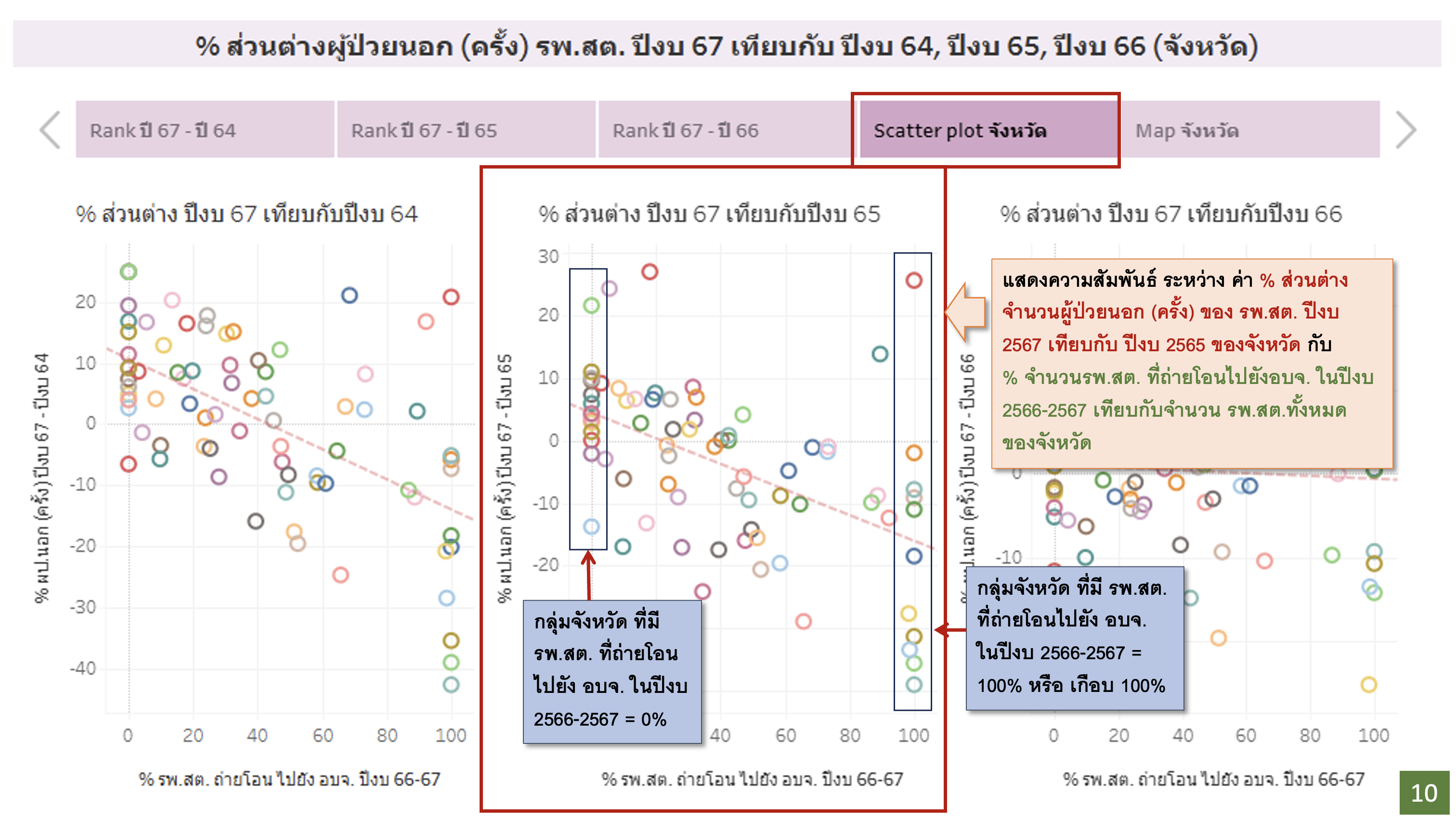 10) การแสดงผลข้อมูล: Scatter plot ความสัมพันธ์ระหว่าง % ส่วนต่างบริการผู้ป่วยนอก (ครั้ง) ปีงบประมาณ 2567 เทียบกับ ปีงบประมาณ 2565 กับ % รพ.สต. ที่ถ่ายโอนไปยัง อบจ. ในปีงบประมาณ 2566-2567 รายจังหวัด