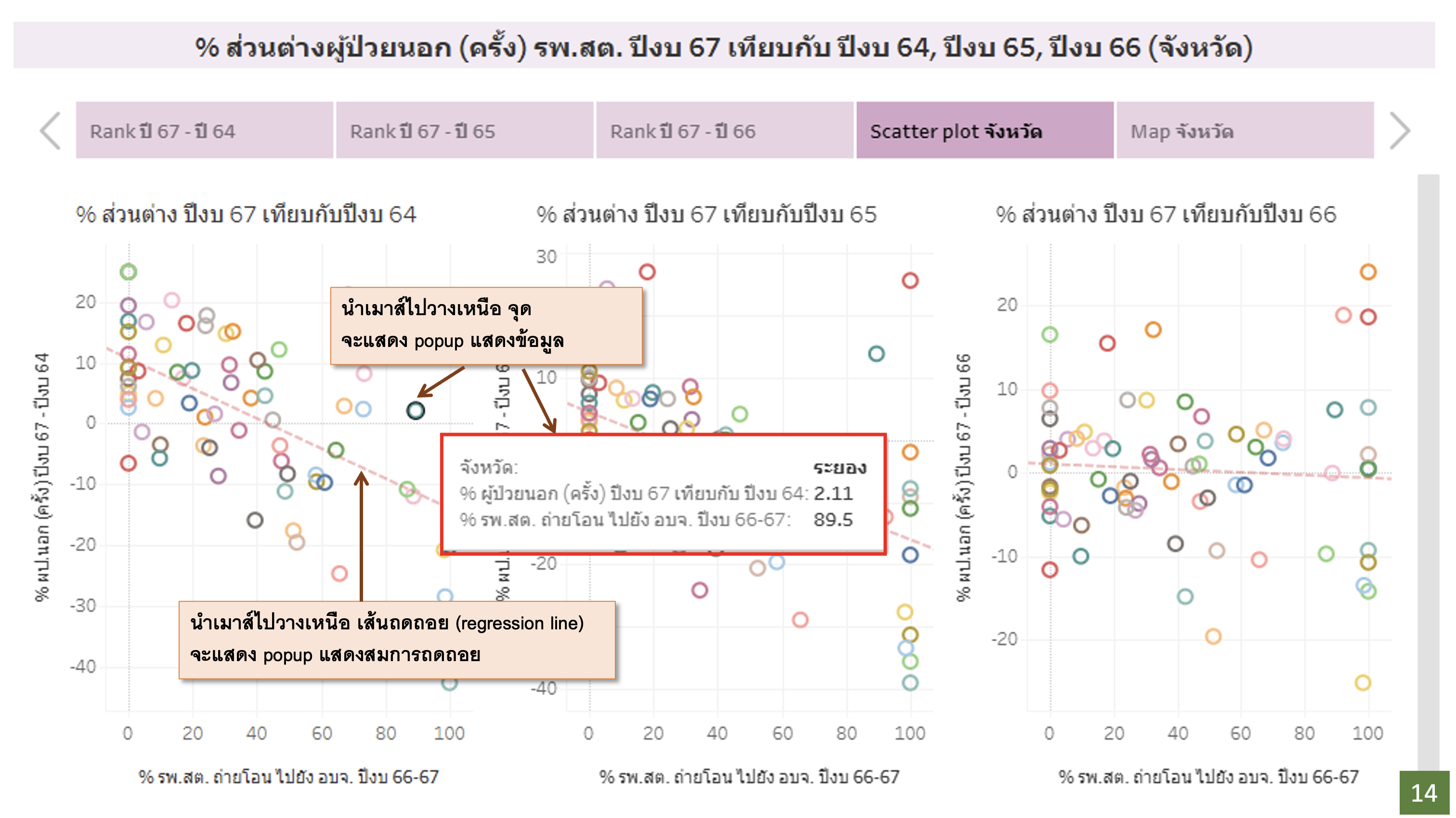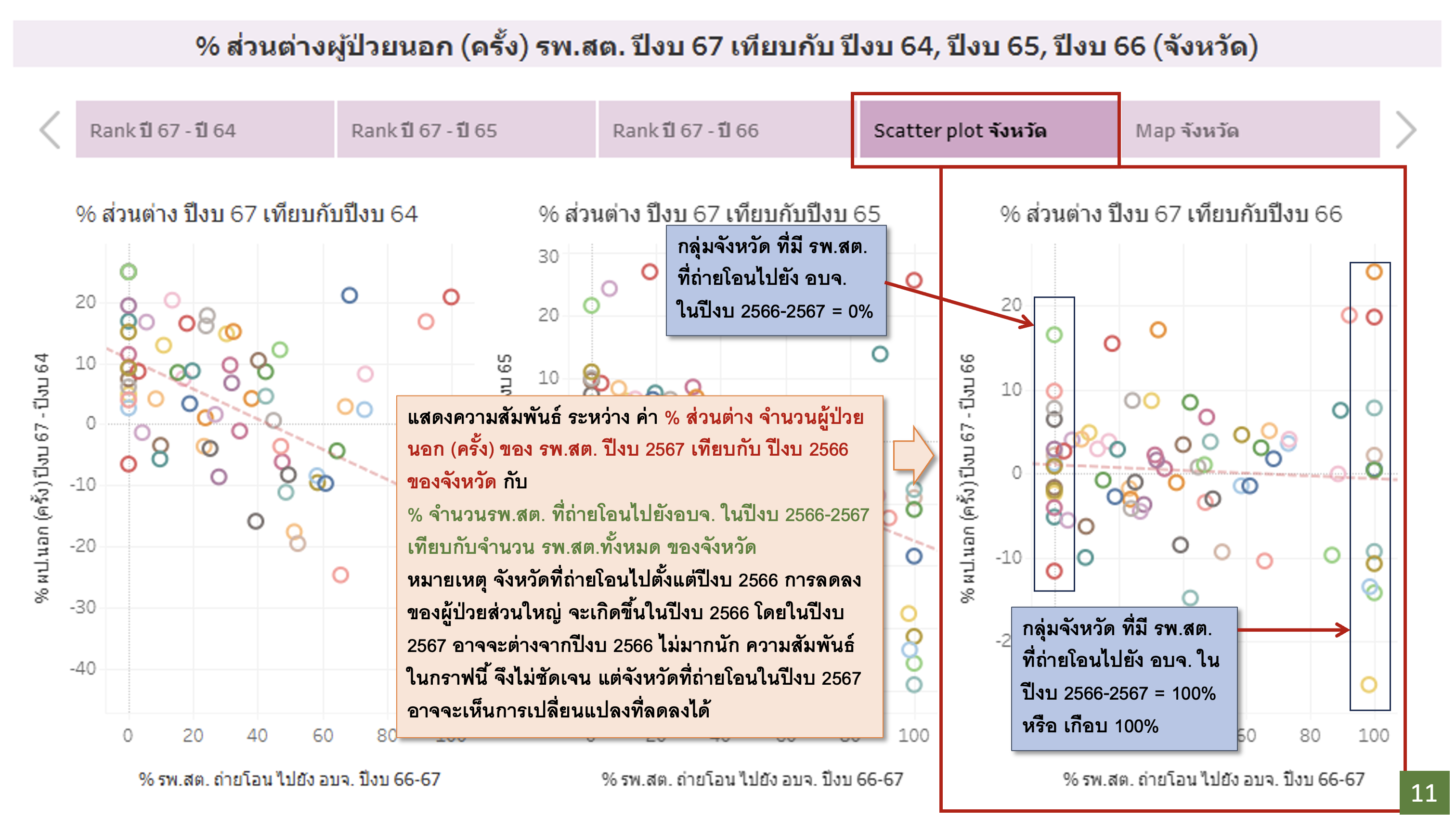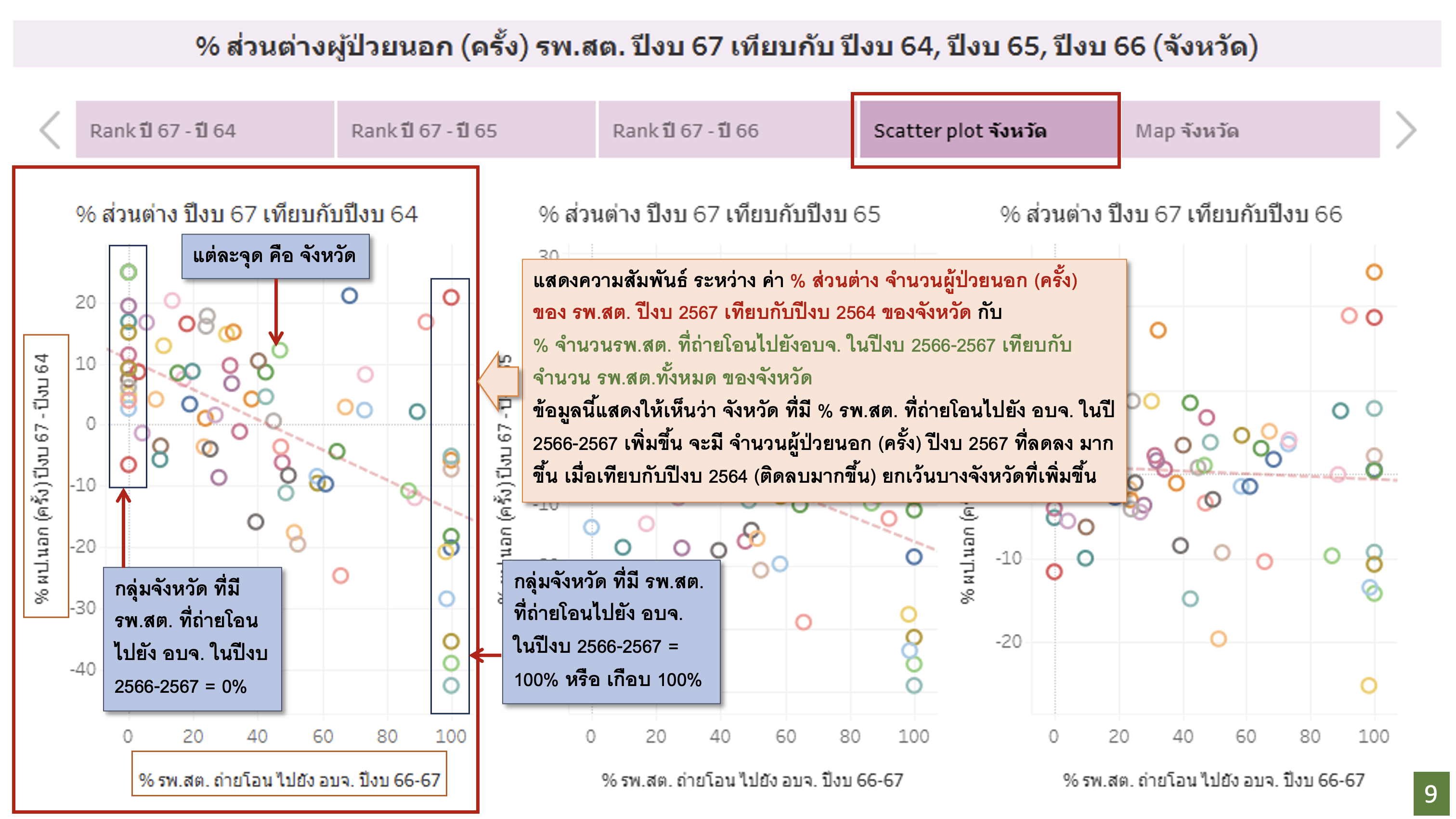 9) การแสดงผลข้อมูล: Scatter plot ความสัมพันธ์ระหว่าง % ส่วนต่างบริการผู้ป่วยนอก (ครั้ง) ปีงบประมาณ 2567 เทียบกับ ปีงบประมาณ 2564 กับ % รพ.สต. ที่ถ่ายโอนไปยัง อบจ. ในปีงบประมาณ 2566-2567 รายจังหวัด
