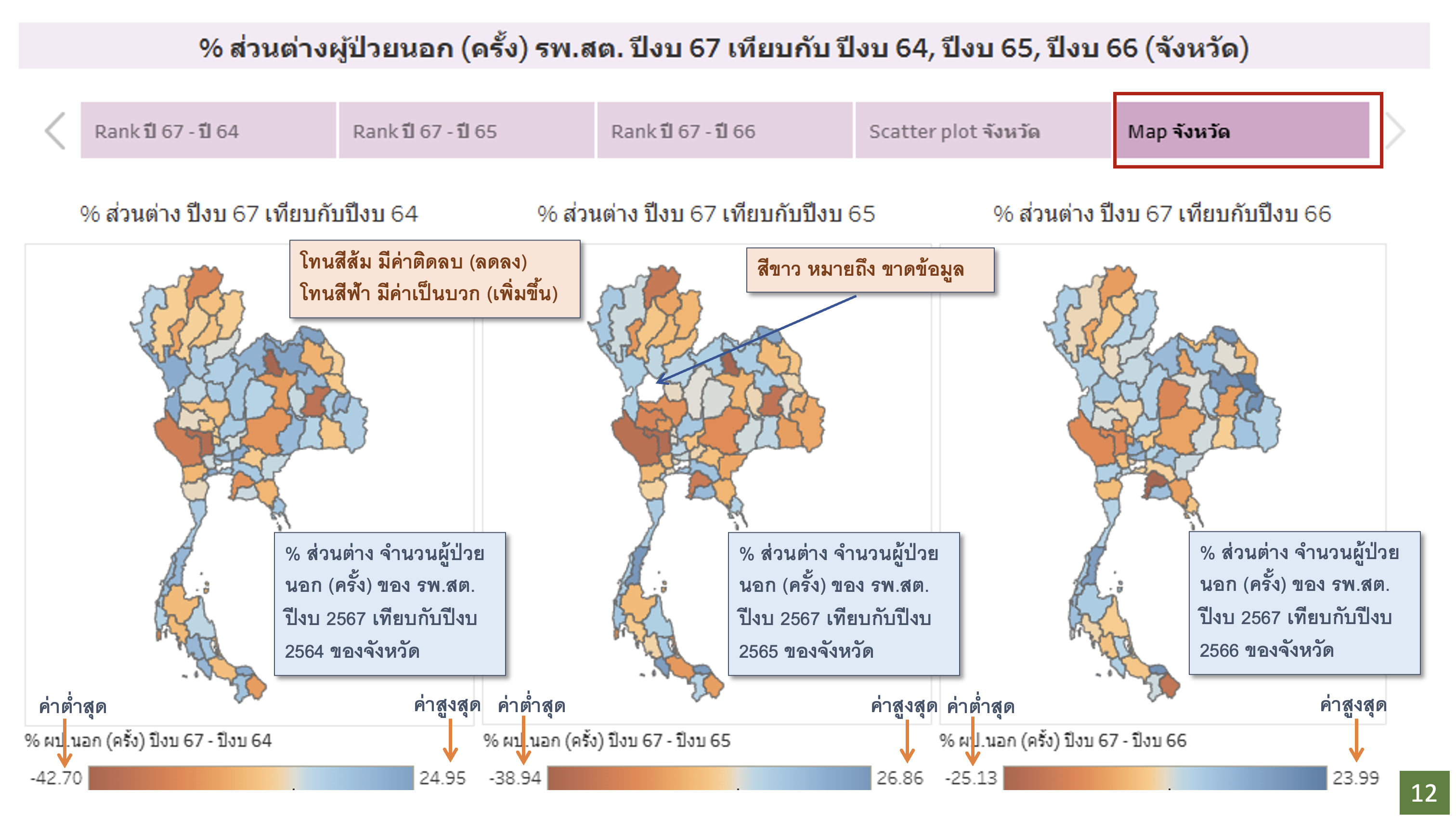 12) การแสดงผลข้อมูล: แผนที่ % ส่วนต่างบริการผู้ป่วยนอก (ครั้ง) ปีงบประมาณ 2567 เทียบกับ ปีงบประมาณ 2564, ปีงบประมาณ 2565 และปีงบประมาณ 2566