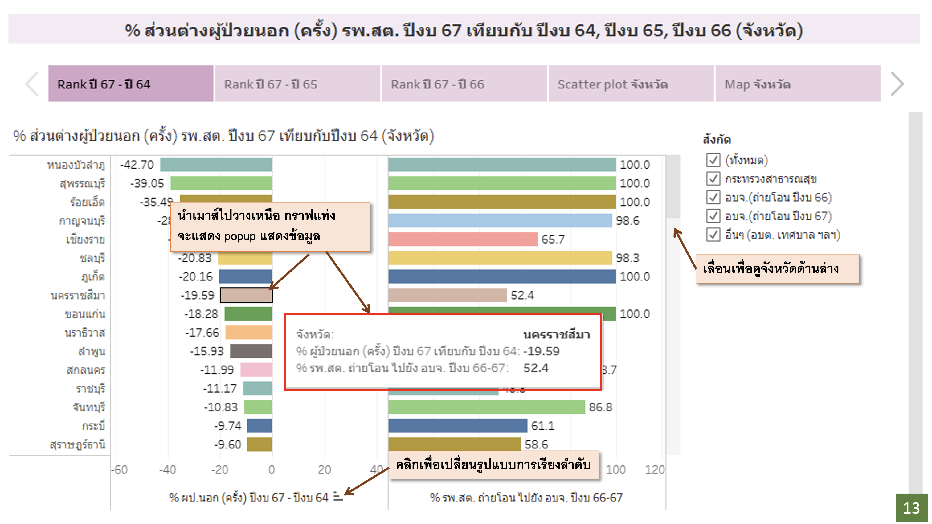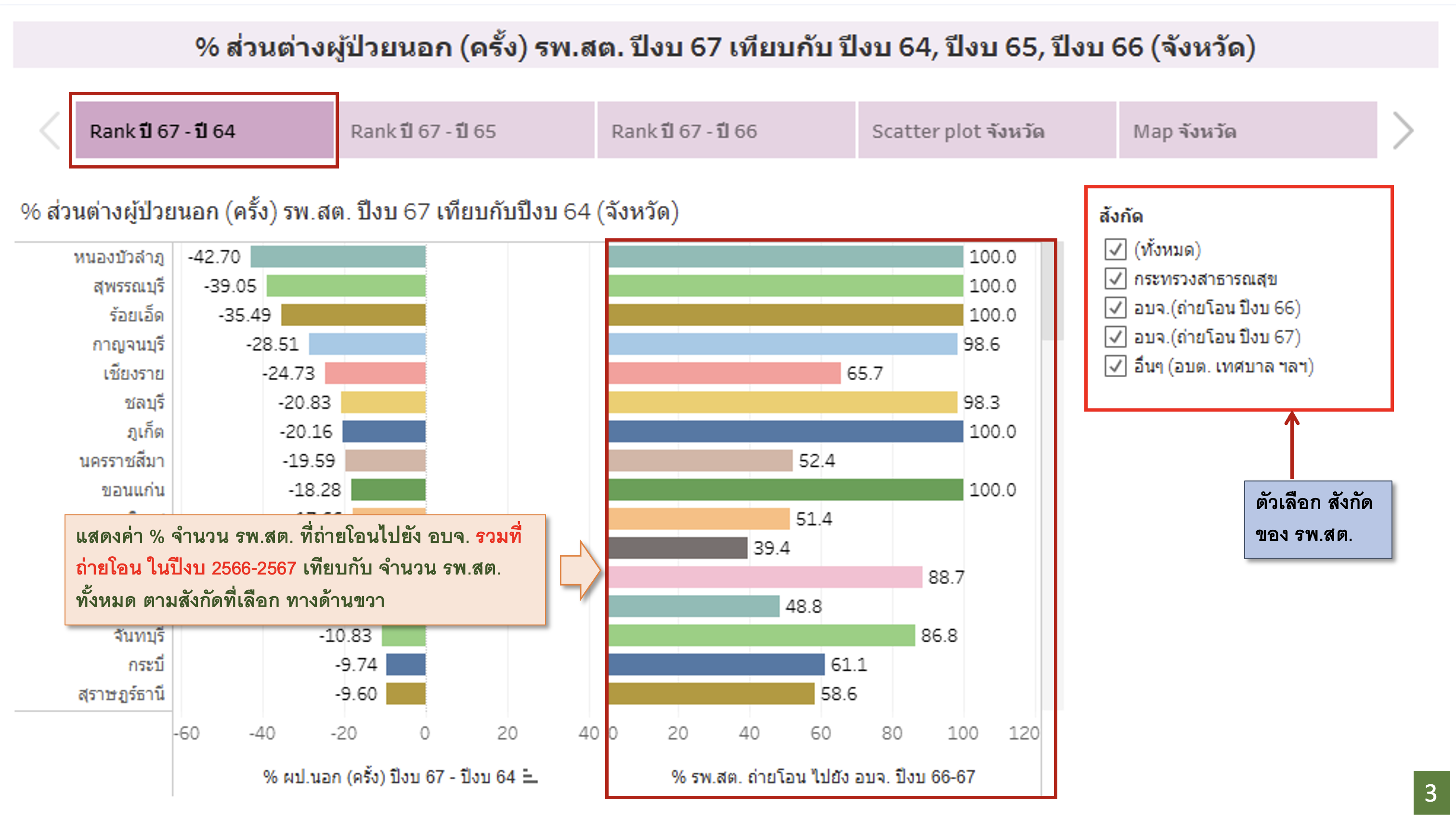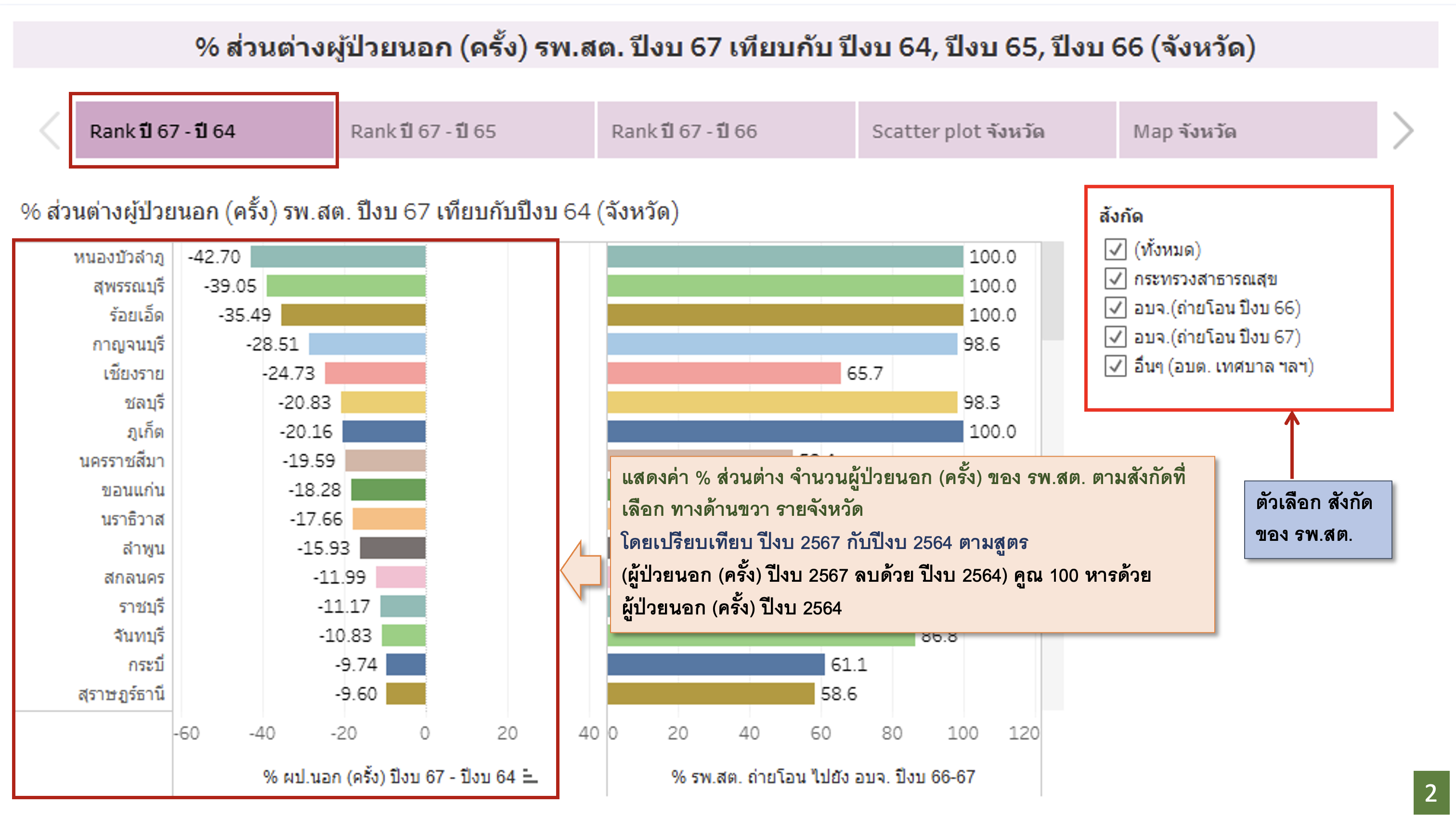 2) การแสดงผลข้อมูล: ข้อมูล % ส่วนต่างบริการผู้ป่วยนอก (ครั้ง) ปีงบประมาณ 2567 เทียบกับ ปีงบประมาณ 2564 เรียงลำดับจังหวัด
