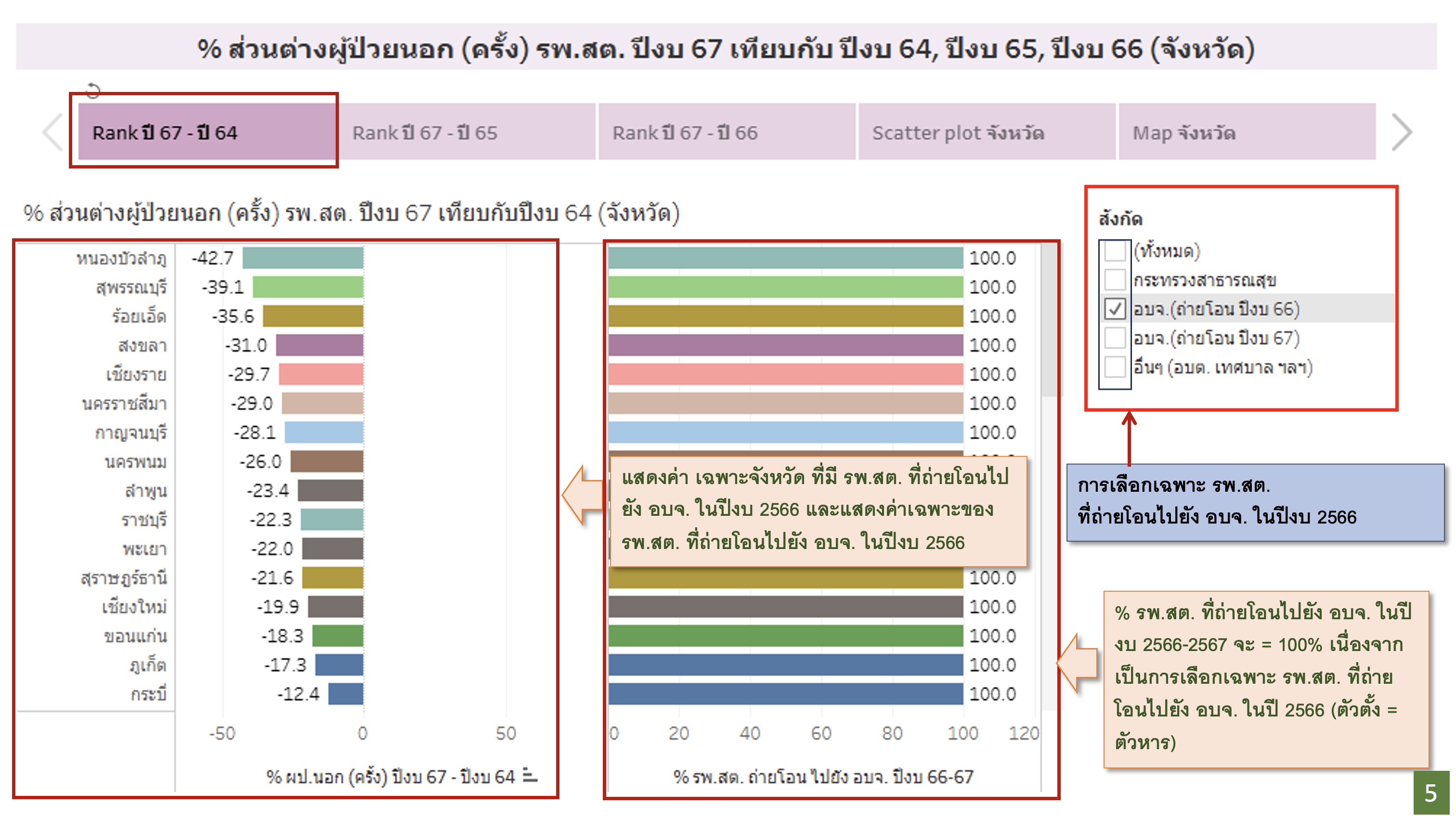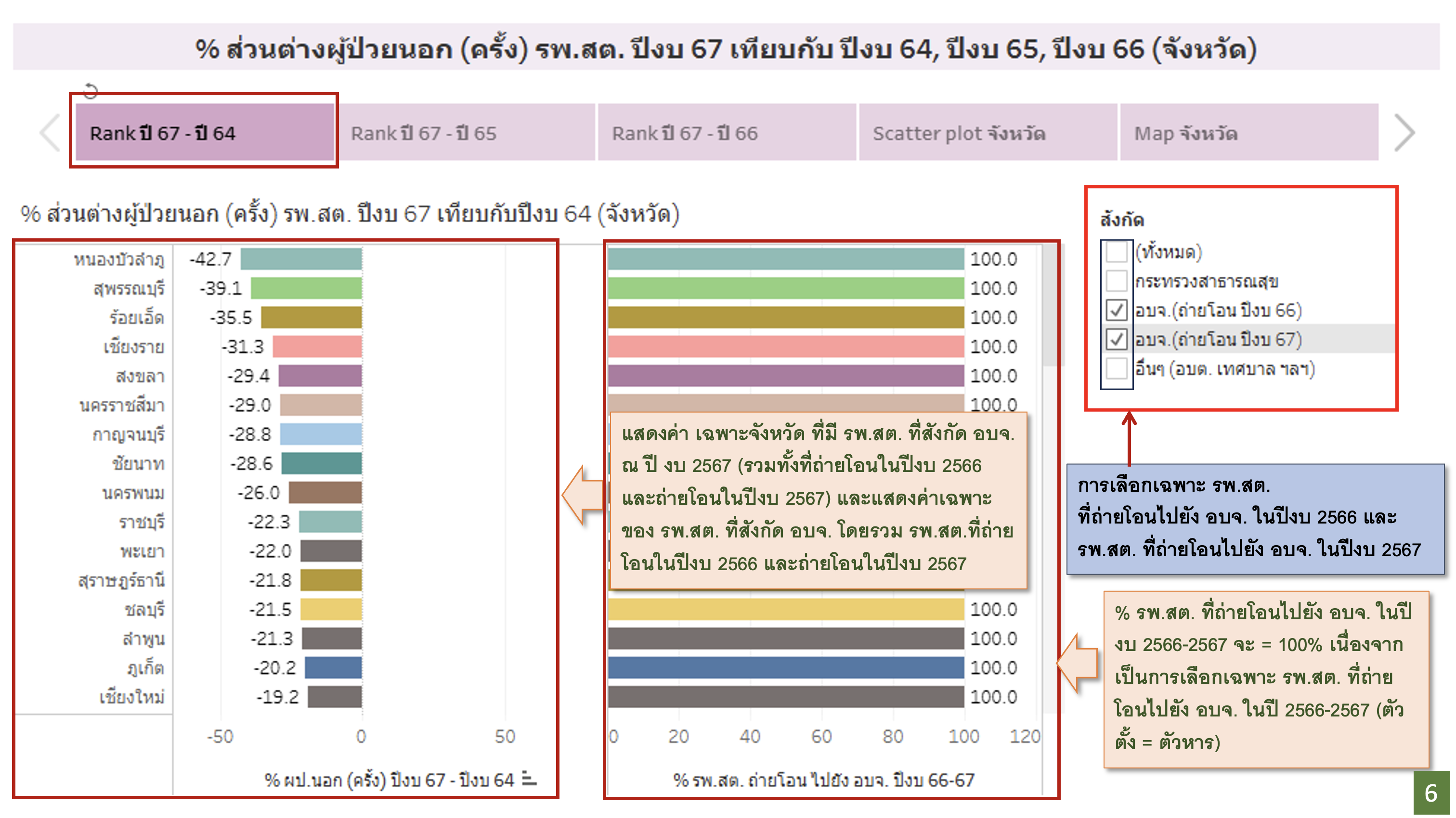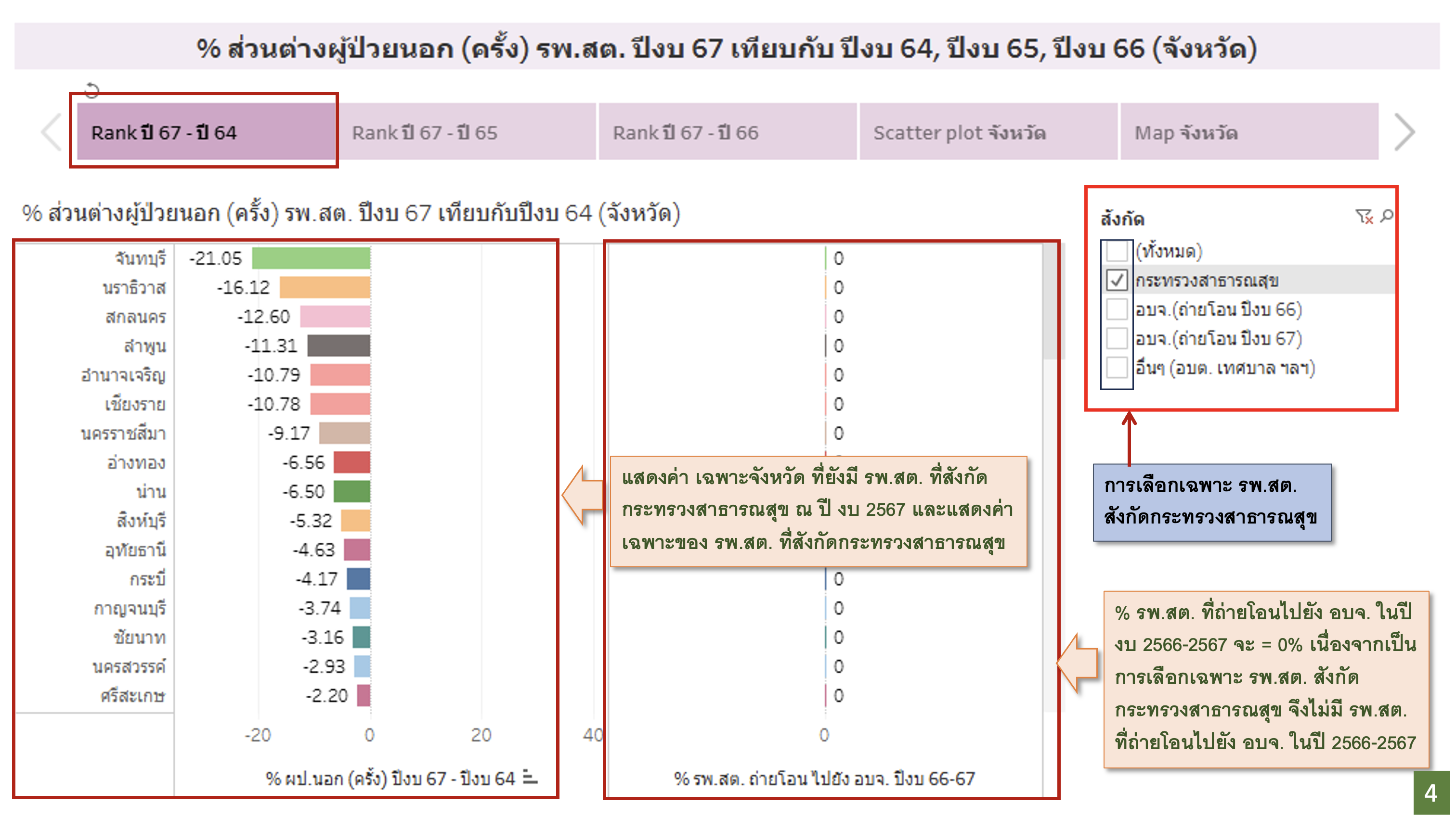 2) การแสดงผลข้อมูล: ข้อมูล % ส่วนต่างบริการผู้ป่วยนอก (ครั้ง) ปีงบประมาณ 2567 เทียบกับ ปีงบประมาณ 2564 เรียงลำดับจังหวัด