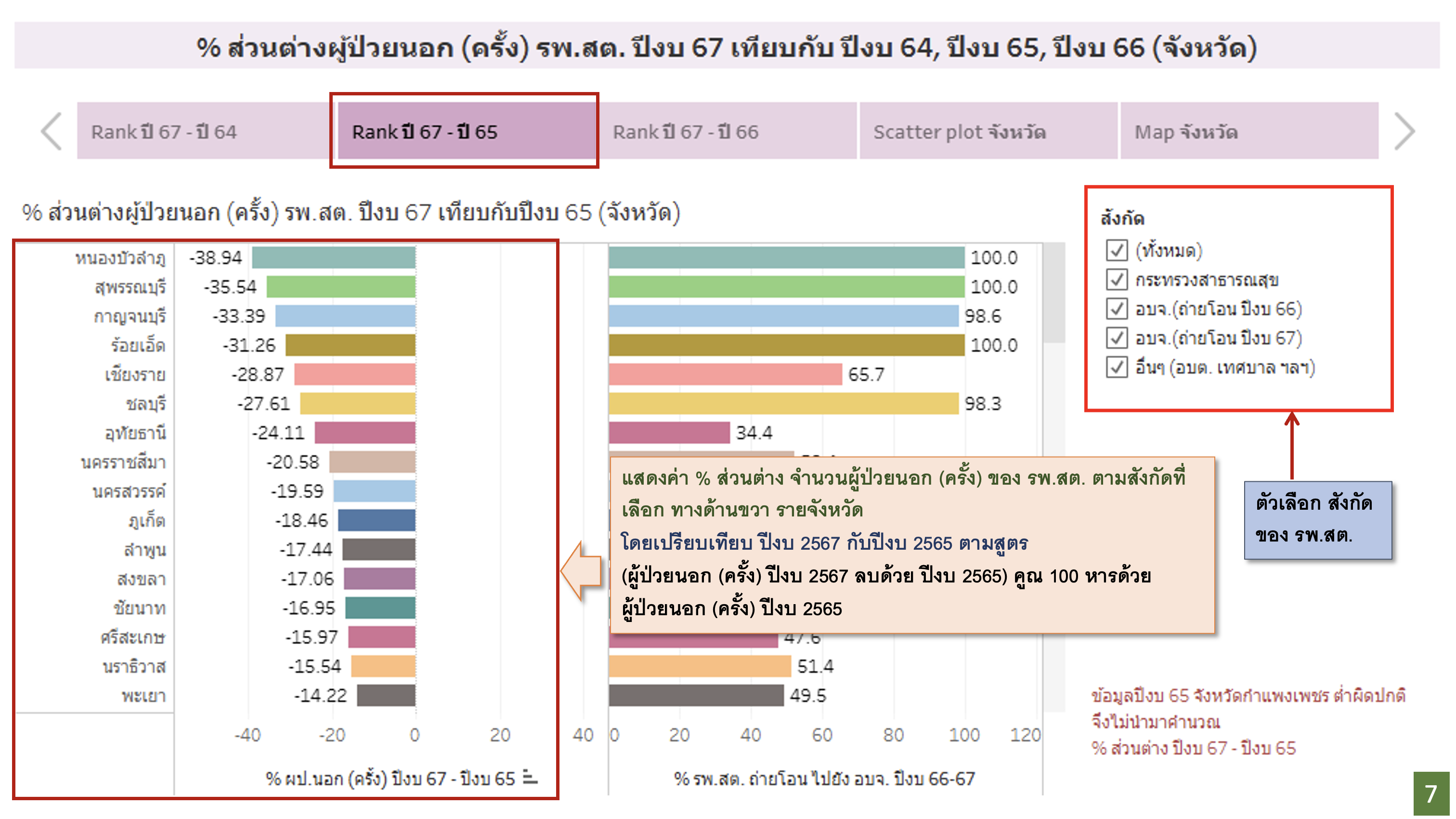 7) การแสดงผลข้อมูล: ข้อมูล % ส่วนต่างบริการผู้ป่วยนอก (ครั้ง) ปีงบประมาณ 2567 เทียบกับ ปีงบประมาณ 2565 เรียงลำดับจังหวัด
