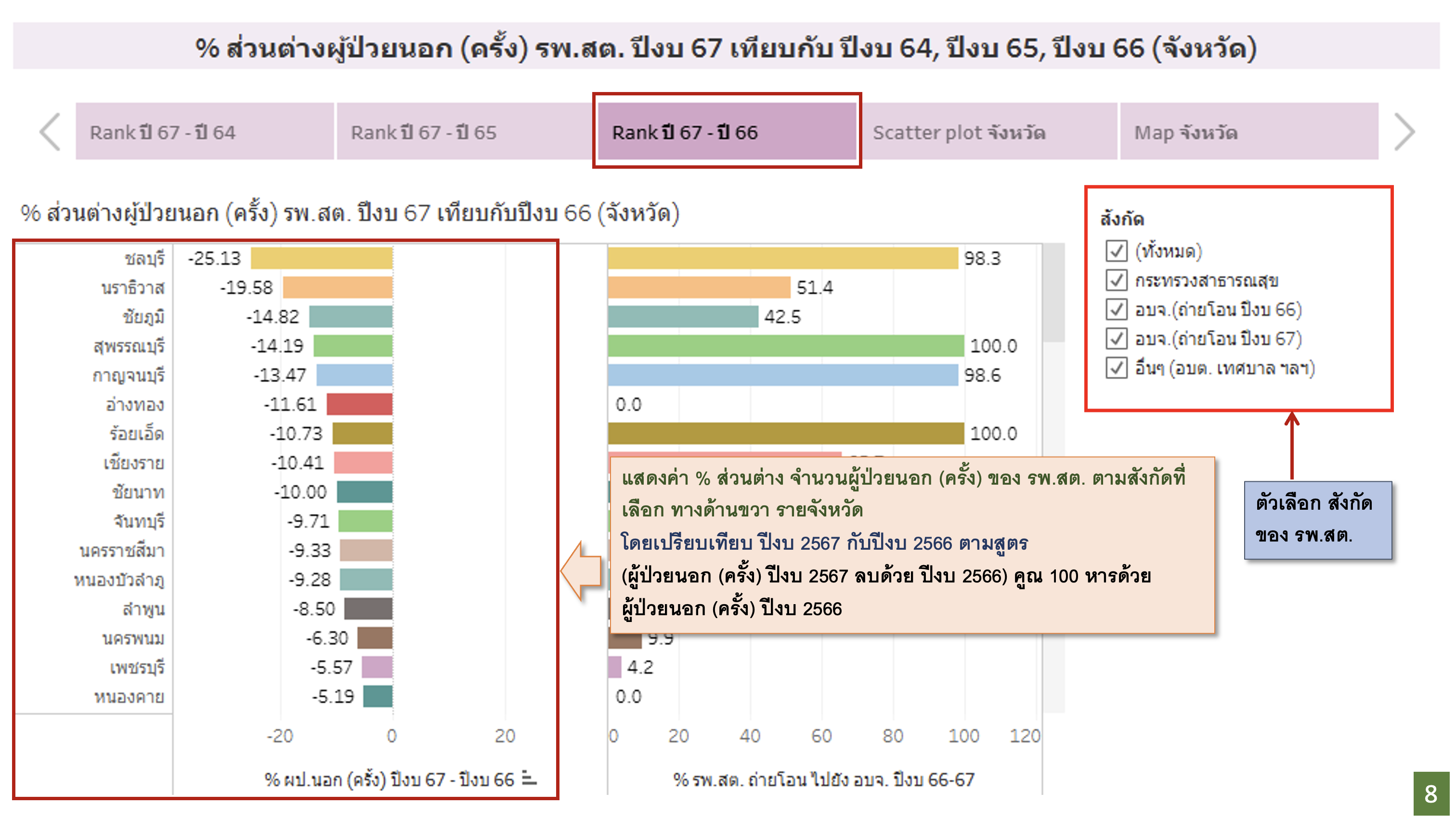 8) การแสดงผลข้อมูล: ข้อมูล % ส่วนต่างบริการผู้ป่วยนอก (ครั้ง) ปีงบประมาณ 2567 เทียบกับ ปีงบประมาณ 2566 เรียงลำดับจังหวัด