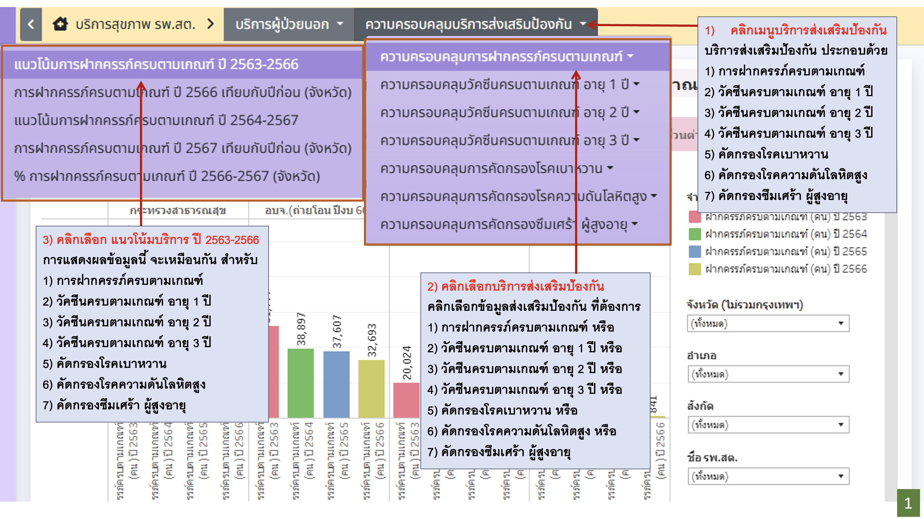 1) การเลือกเมนู: ข้อมูลบริการส่งเสริมป้องกัน แนวโน้มบริการ ปีงบ 2563-2566