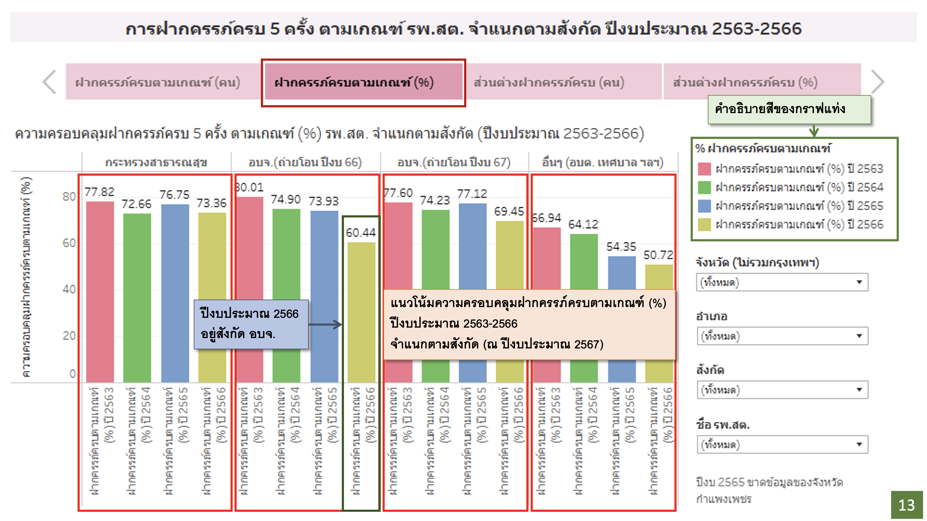 13) การแสดงผลข้อมูล: แนวโน้มความครอบคลุมบริการ (%) ปีงบประมาณ 2563-2566 จำแนกตามสังกัด