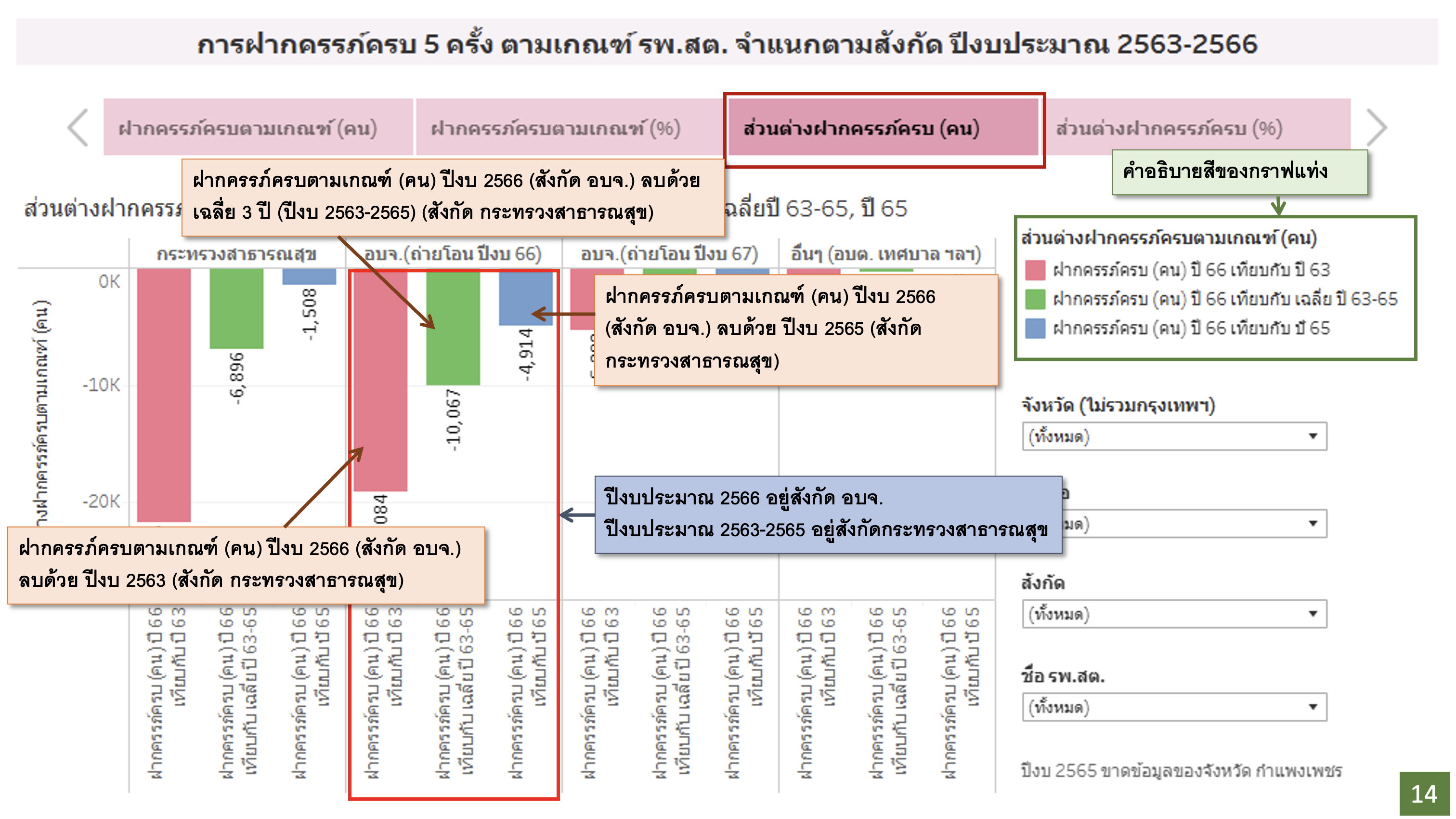 14) การแสดงผลข้อมูล: ส่วนต่างจำนวนบริการ (คน) ปีงบประมาณ 2566 เทียบกับปีงบประมาณ 2563, เฉลี่ยปีงบประมาณ 2563-2565 และปีงบประมาณ 2565
