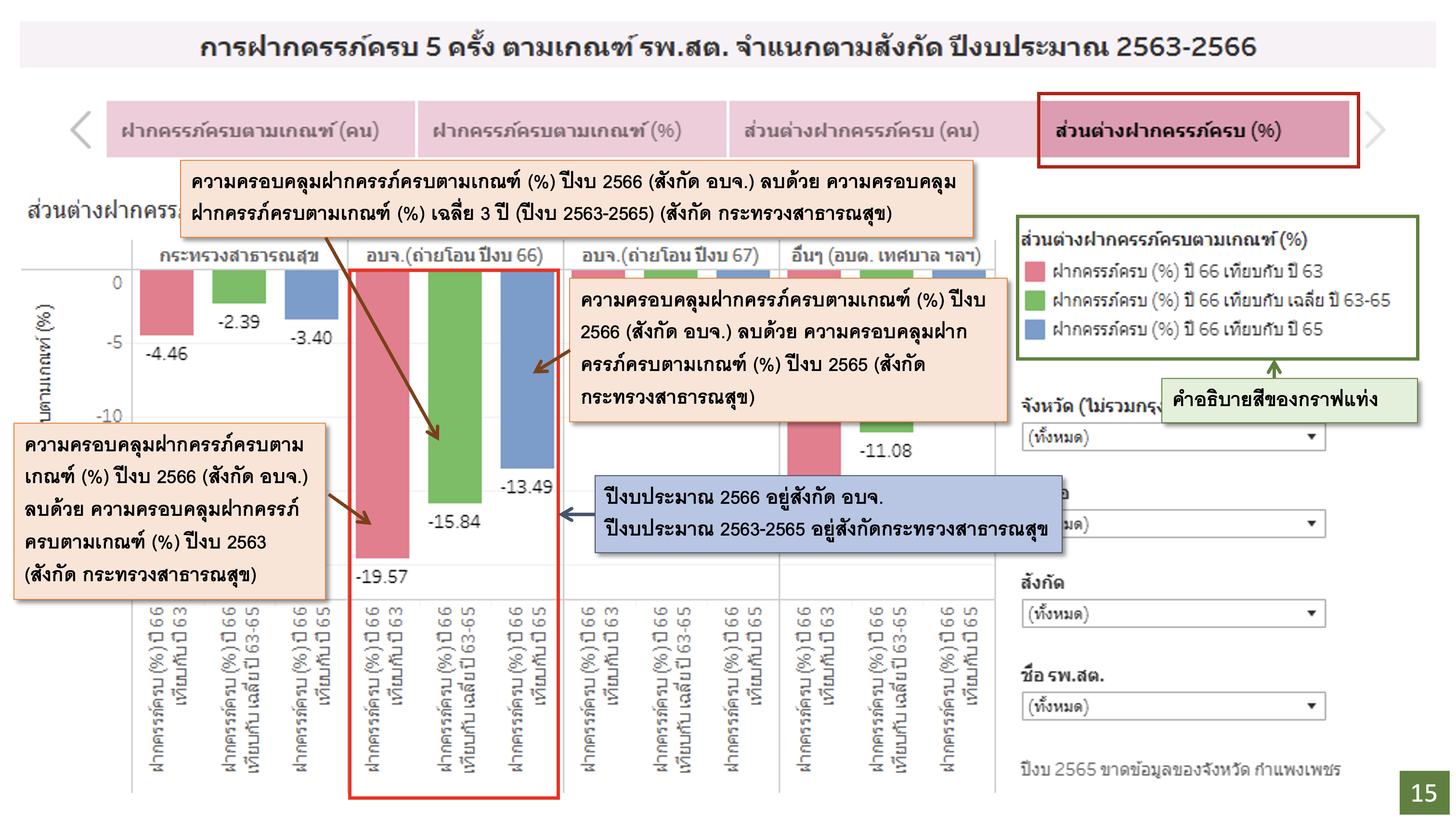 15) การแสดงผลข้อมูล: ส่วนต่างความครอบคลุมบริการ (%) ปีงบประมาณ 2566 เทียบกับปีงบประมาณ 2563, เฉลี่ยปีงบประมาณ 2563-2565 และปีงบประมาณ 2565