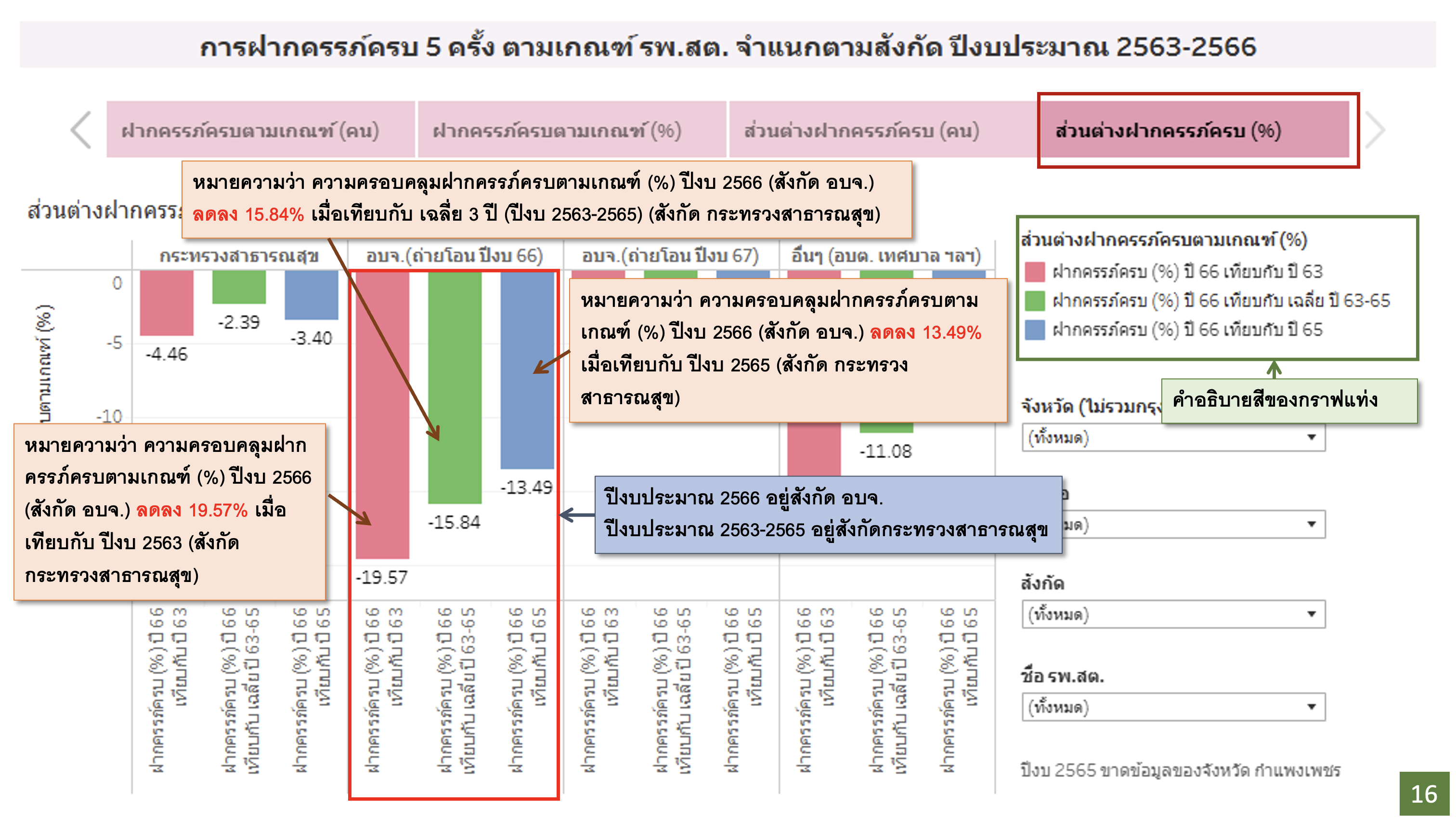 16) การอธิบายข้อมูล: ส่วนต่างความครอบคลุมบริการ (%) ปีงบประมาณ 2566 เทียบกับปีงบประมาณ 2563, เฉลี่ยปีงบประมาณ 2563-2565 และปีงบประมาณ 2565