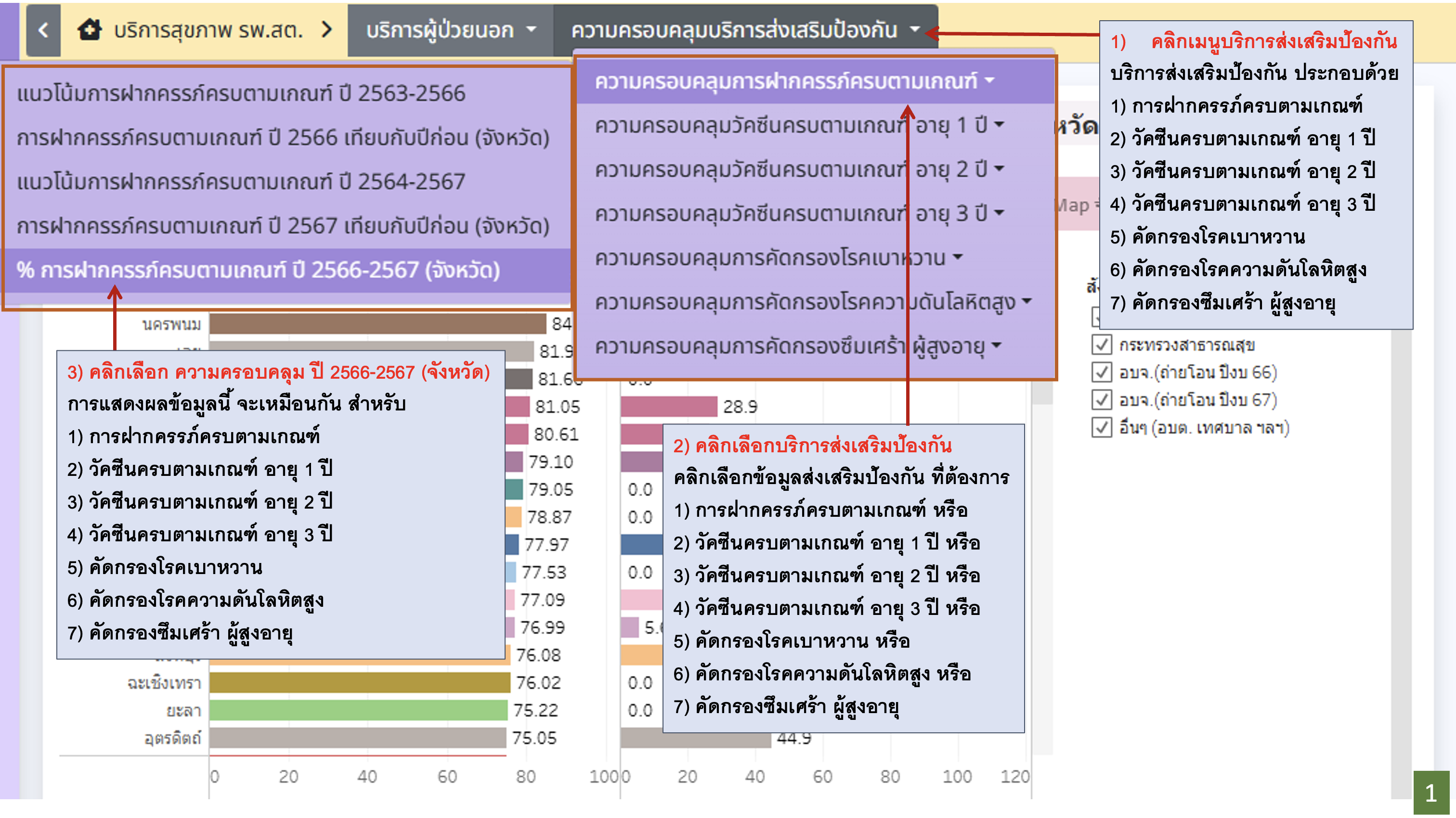 1) การเลือกเมนู: ข้อมูลบริการส่งเสริมป้องกัน ความครอบคลุมบริการ ปีงบ 2566-2567 (จังหวัด)