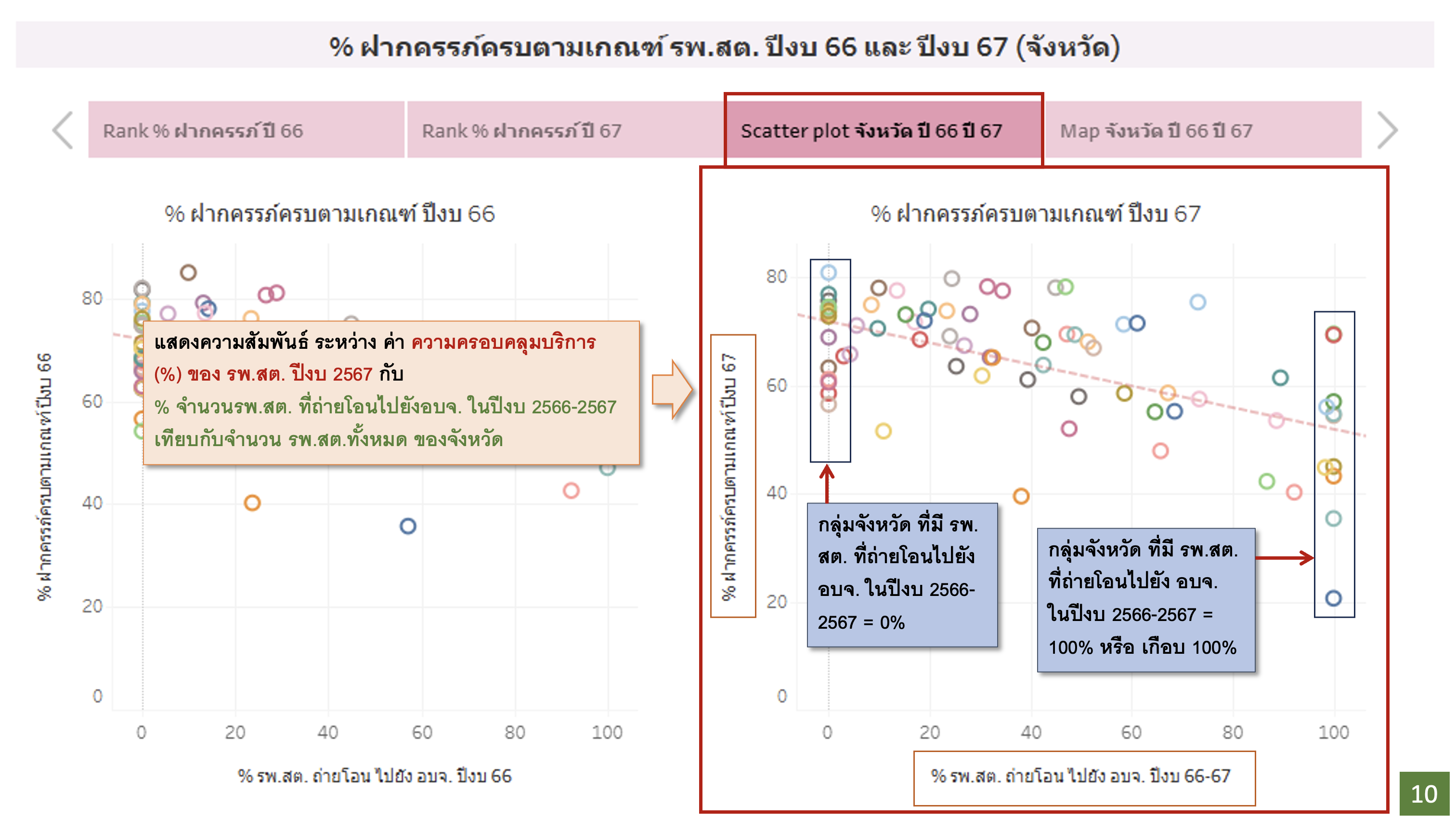 10) การแสดงผลข้อมูล: Scatter plot ความสัมพันธ์ระหว่าง ความครอบคลุมบริการ (%) ปีงบประมาณ 2567 กับ % รพ.สต. ที่ถ่ายโอนไปยัง อบจ. ในปีงบประมาณ 2566-2567 รายจังหวัด