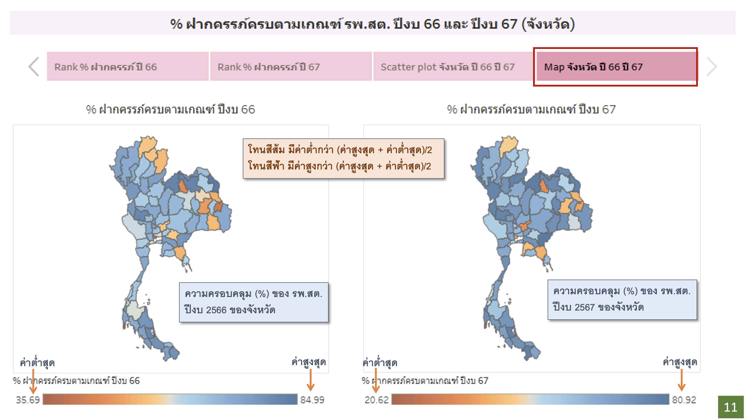 11) การแสดงผลข้อมูล: แผนที่ ความครอบคลุมบริการ (%) ปีงบประมาณ 2566 และปีงบประมาณ 2567