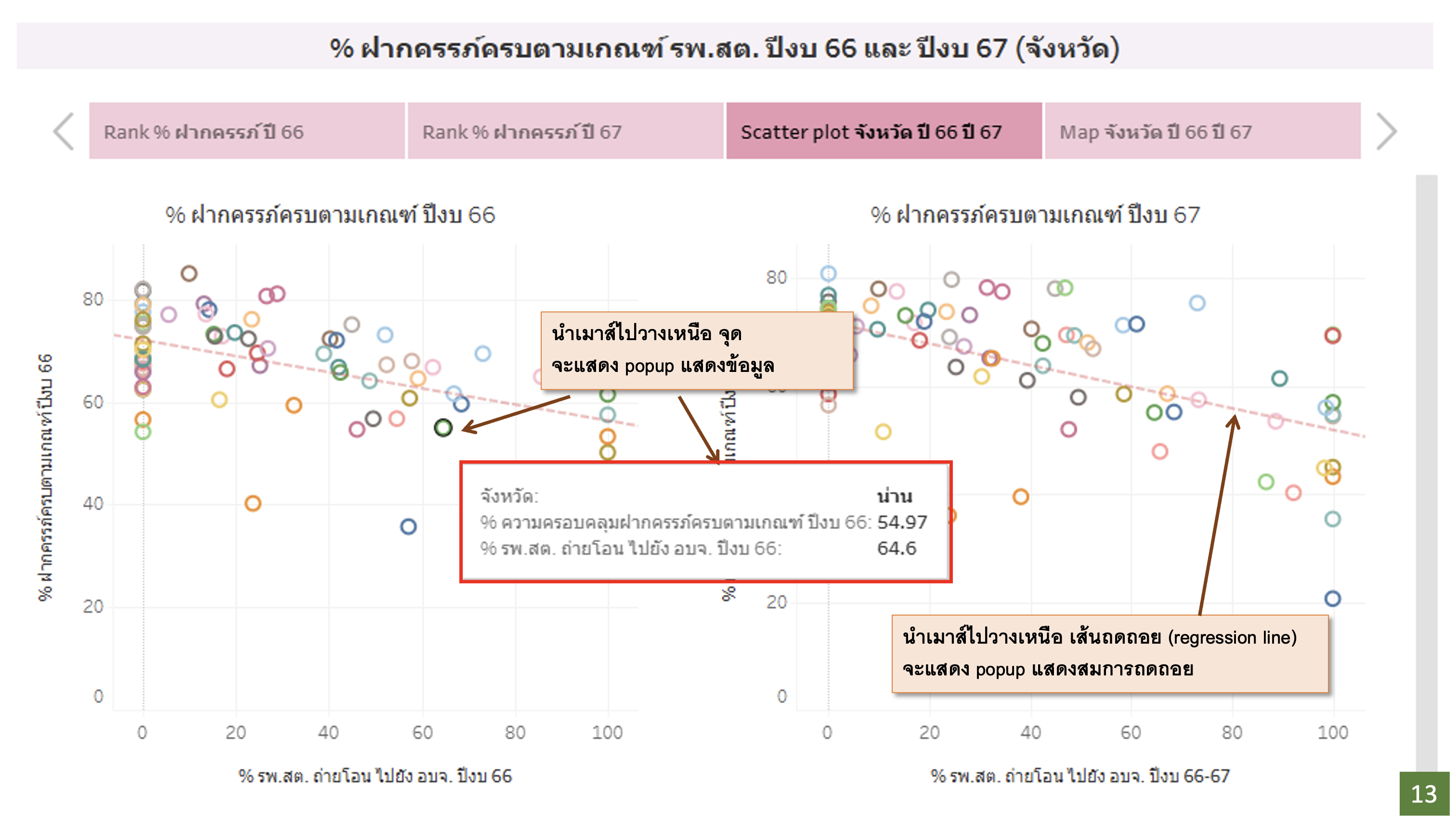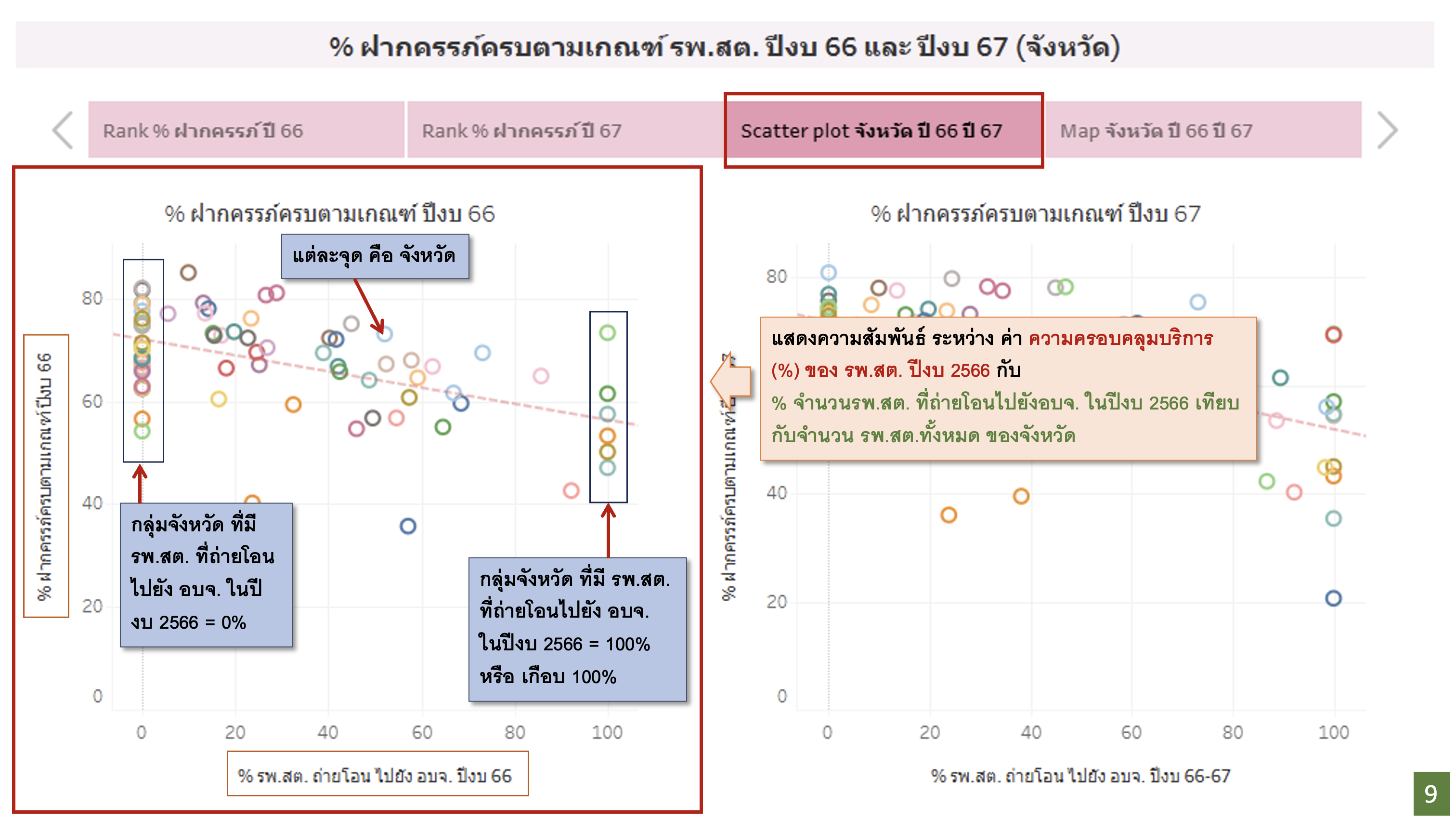 9) การแสดงผลข้อมูล: Scatter plot ความสัมพันธ์ระหว่าง ความครอบคลุมบริการ (%) ปีงบประมาณ 2566 กับ % รพ.สต. ที่ถ่ายโอนไปยัง อบจ. ในปีงบประมาณ 2566 รายจังหวัด