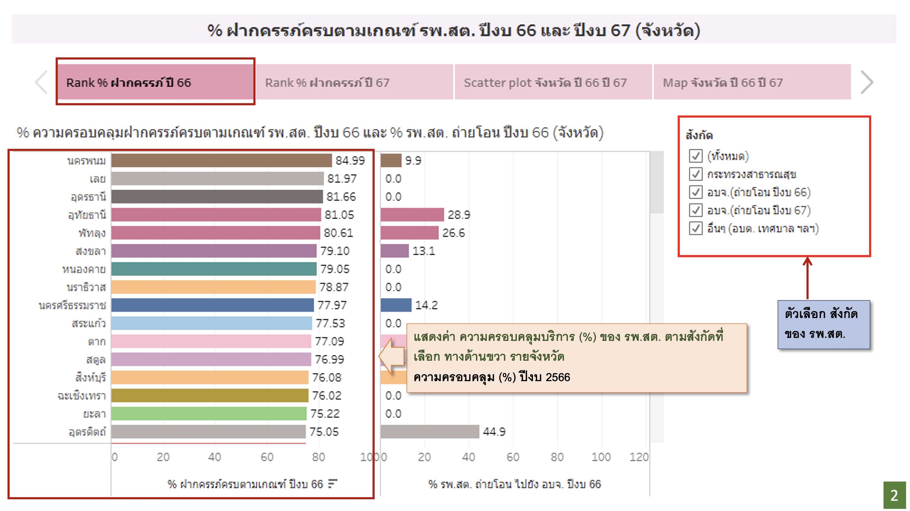 2) การแสดงผลข้อมูล: ข้อมูล ความครอบคลุมบริการ (%) ปีงบประมาณ 256 เรียงลำดับจังหวัด