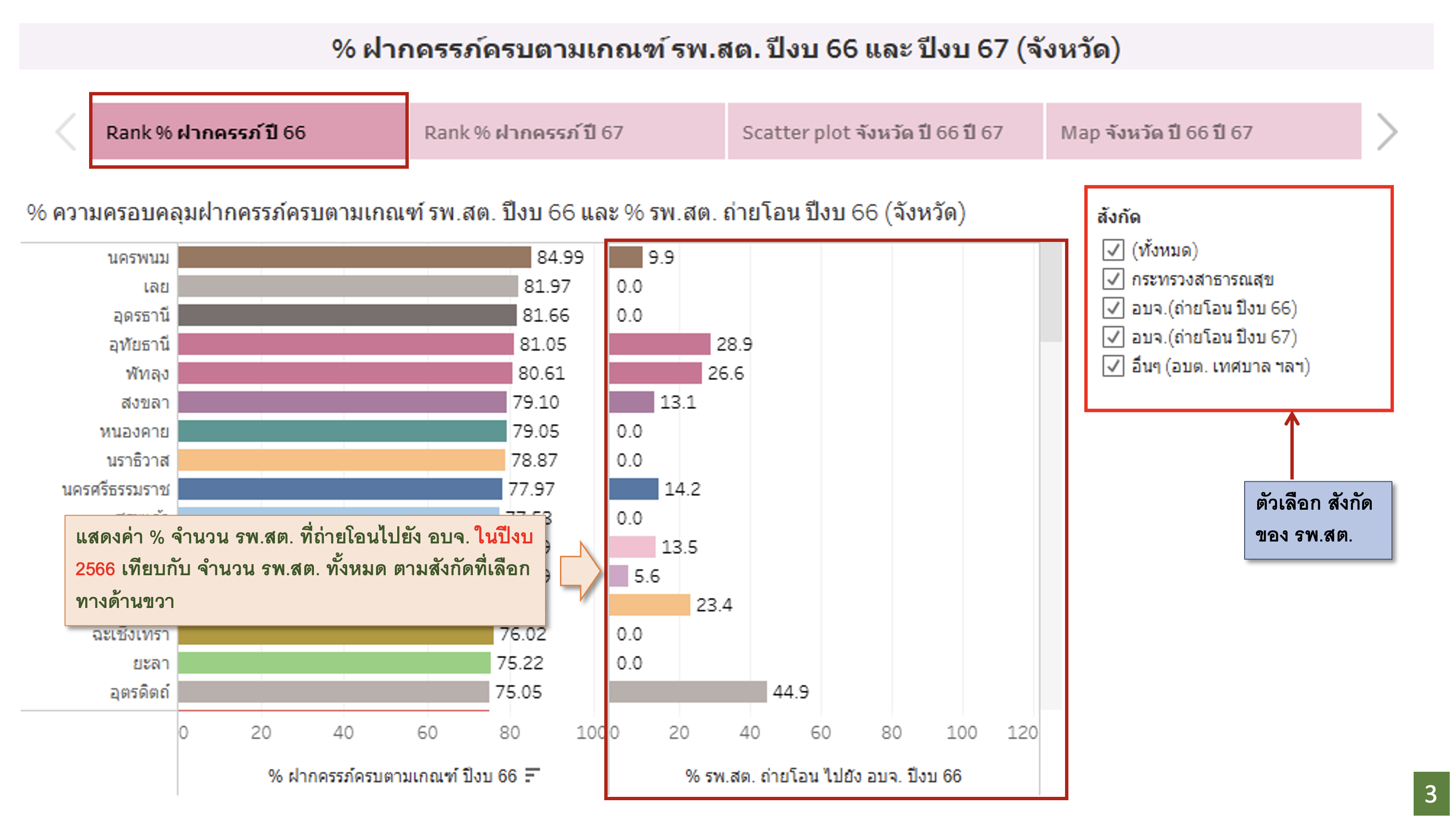 3) การแสดงผลข้อมูล: ข้อมูล % รพ.สต. ที่ถ่ายโอนไปยัง อบจ. ในปีงบประมาณ 2566 รายจังหวัด