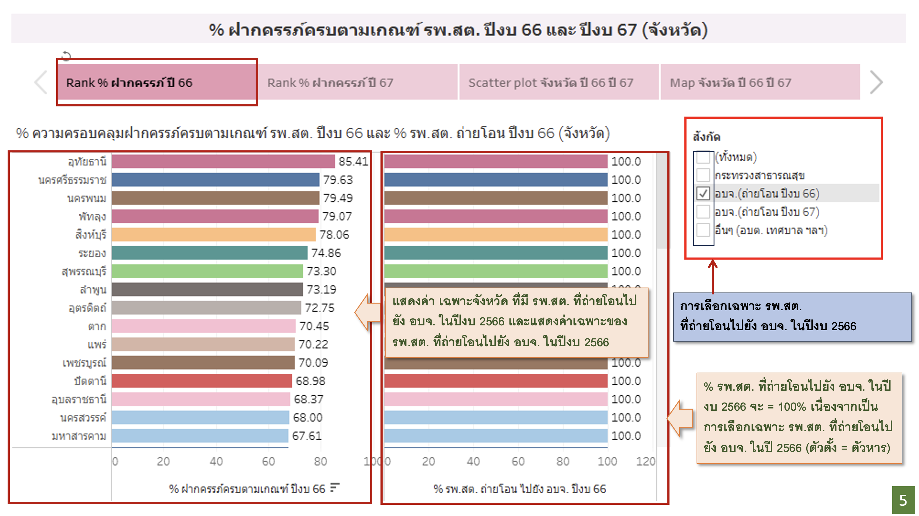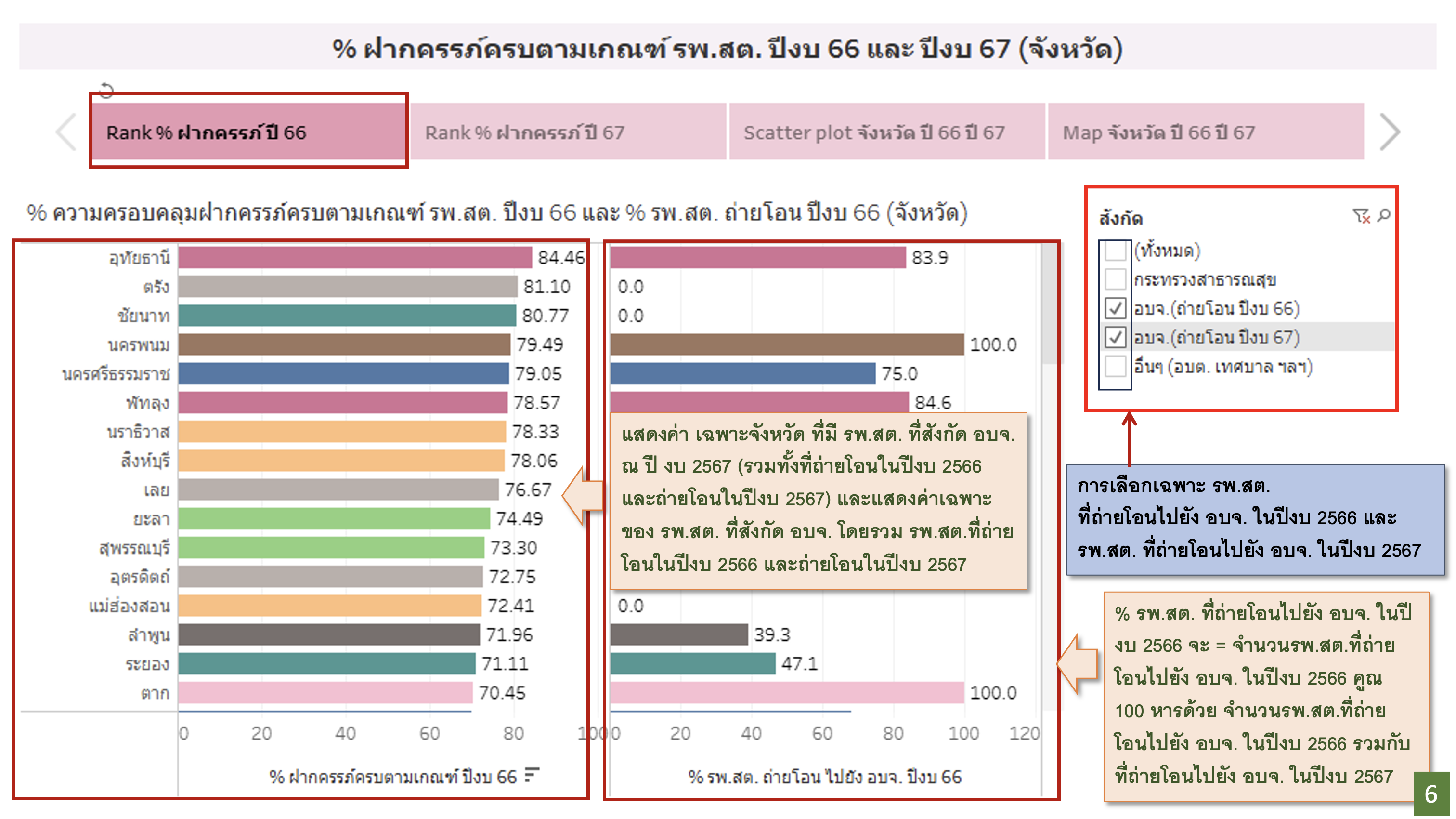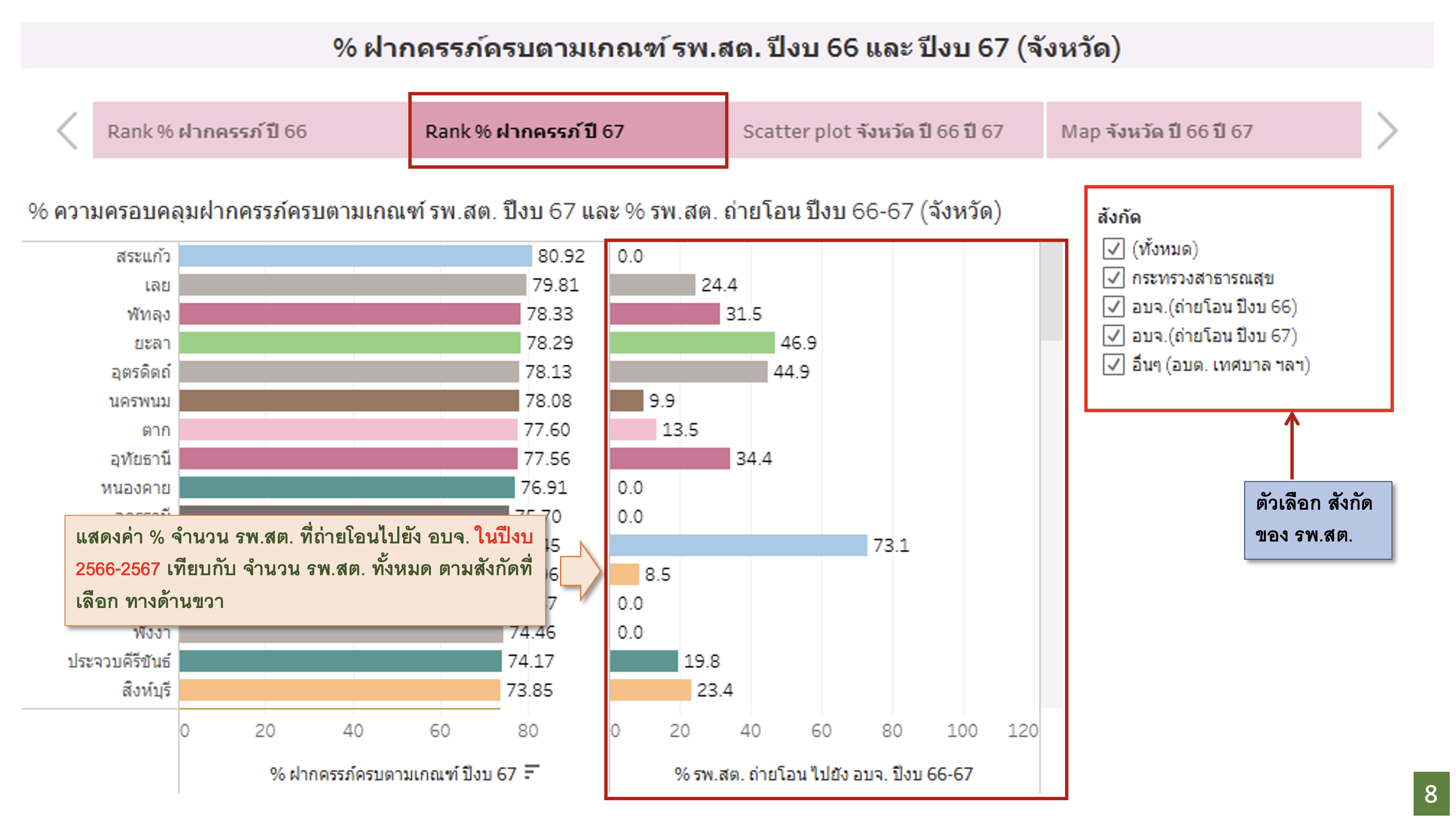 8) การแสดงผลข้อมูล: ข้อมูล ข้อมูล % รพ.สต. ที่ถ่ายโอนไปยัง อบจ. ในปีงบประมาณ 2566-2567 รายจังหวัด