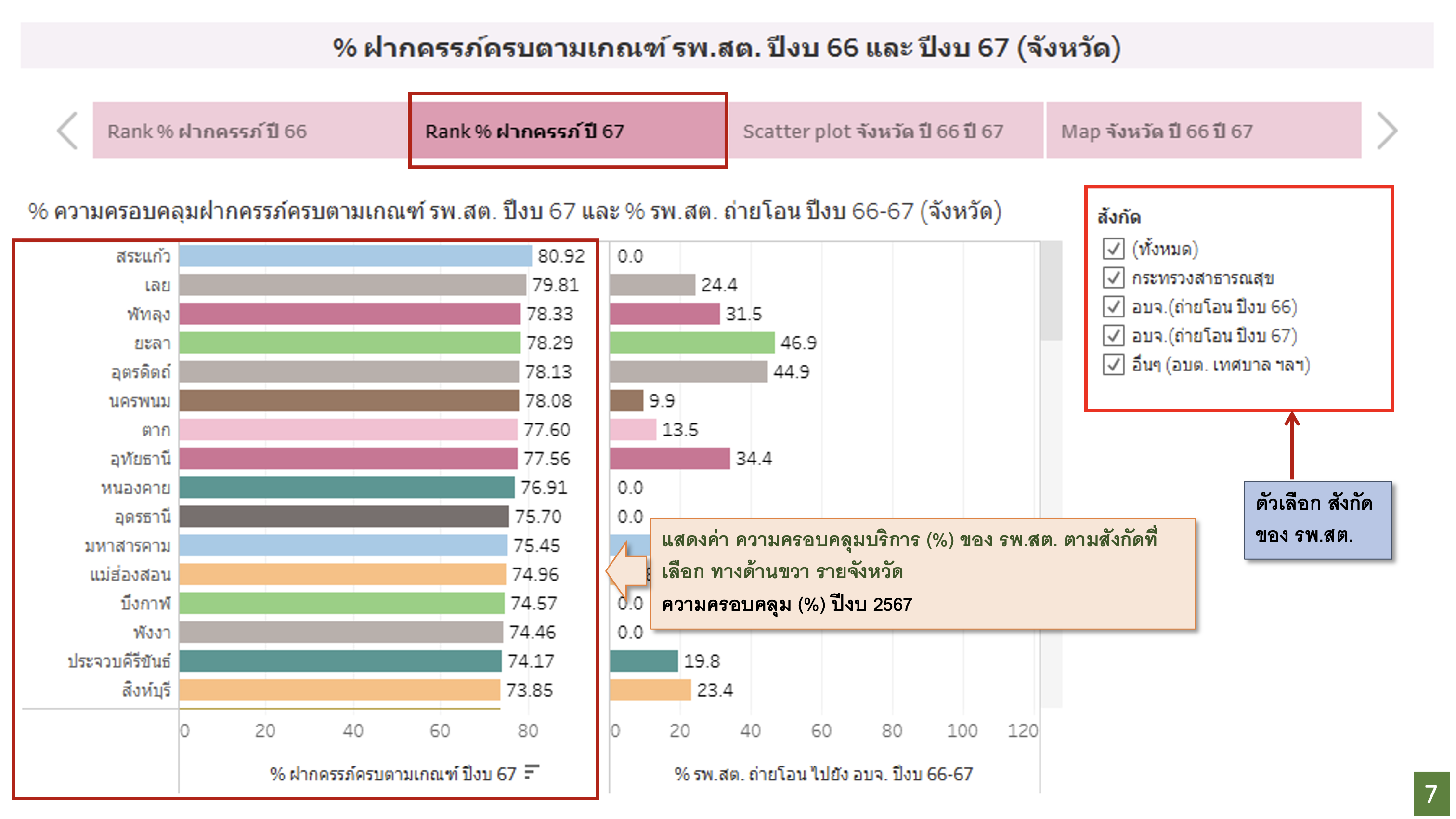 7) การแสดงผลข้อมูล: ข้อมูล ความครอบคลุมบริการ (%) ปีงบประมาณ 2567 เรียงลำดับจังหวัด
