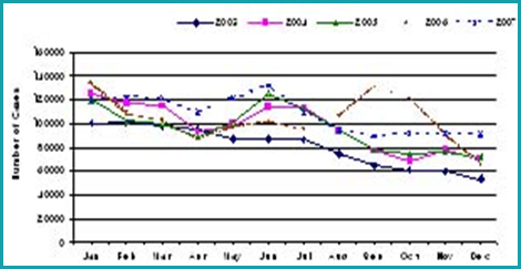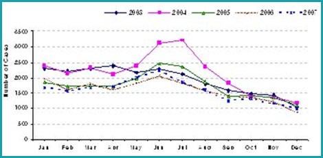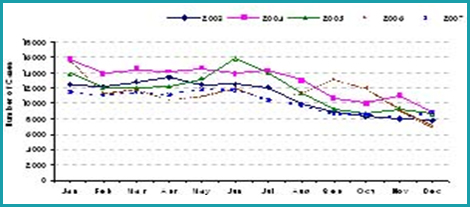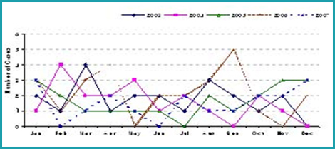 จากรายงานผู้ป่วยโรคพิษสุนัขบ้า (Rabies) ของสำนักระบาดวิทยา กรมควบคุมโรค กระทรวงสาธารณสุขตั้งแต่ปี พ.ศ.2546 -2550 พบว่า อัตราผู้ป่วยด้วยโรคพิษสุนัขบ้ามีแนวโน้มลดลง แต่เมื่อพิจารณาในแต่ละปีแล้ว พบว่ามีจำนวนผู้ป่วยมากในช่วงเดือนกุมภาพันธ์ - พฤษภาคม ของทุกปี (รูปที่ 4)