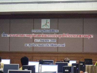 ด้วยเหตุนี้ นพ.พินิจ ฟ้าอำนวยผล ผู้อำนวยการ สำนักงานพัฒนาระบบข้อมูลข่าวสารสุขภาพจึงได้จัดโครงการอบรมเชิงปฏิบัติการเรื่อง ระบบสารสนเทศภูมิศาสตร์และการประยุกต์ใช้ในงานสาธารณสุข เพื่อพัฒนาศักยภาพในการประยุกต์ใช้ระบบสารสนเทศภูมิศาสตร์เพื่อระบบสุขภาพ และเป็นช่องทางหนึ่งในการสร้างเครือข่ายการเรียนรู้ด้านสารสนเทศภูมิศาสตร์ โดยเนื้อหาและวิทยากรในการอบรมครั้งนี้ได้รับการสนับสนุนจาก บริษัท อีเอสอาร์ไอ (ประเทศไทย) ซึ่งเป็นบริษัทที่ให้บริการทางด้านระบบสารสนเทศทางภูมิศาสตร์ หรือ จีไอเอส (Geographic Information System: GIS) ในประเทศไทย