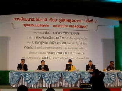 การประชุมครั้งนี้เป็นวาระการประชุมระดับชาติเรื่องอุบัติเหตุจราจรครั้งที่ 7 ในหัวข้อ ชุมชนถนนปลอดภัย มอเตอร์ไซด์ปลอดอุบัติเหตุ โดยมีจำนวนผู้ให้ความสนใจเข้าร่วมงานและฟังการบรรยายจากวิทยากรประมาณ 1,500 คน โดยมี ศ.นพ.ประเวศ วะสี ราษฎรอาวุโส แสดงปาฐกถาเรื่องการพัฒนาระบบป้องกันอุบัติเหตุจราจรในชุมชนอย่างยั่งยืน