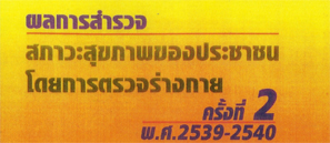 อ่านต่อนำเสนอผลการสำรวจสภาวะสุขภาพประชาชนไทยโดยการตรวจร่างกายครั้งที่ 2 ในกลุ่มอายุ 0-5 ปี 6-12 ปี 13-59 ปี และ 60 ปีขึ้นไป ครอบคลุมข้อมูลสุขภาพเด็ก ระดับสติปัญญา พฤติกรรมเสี่ยง สุขภาพวัยแรงงาน และสุขภาพผู้สูงอายุ